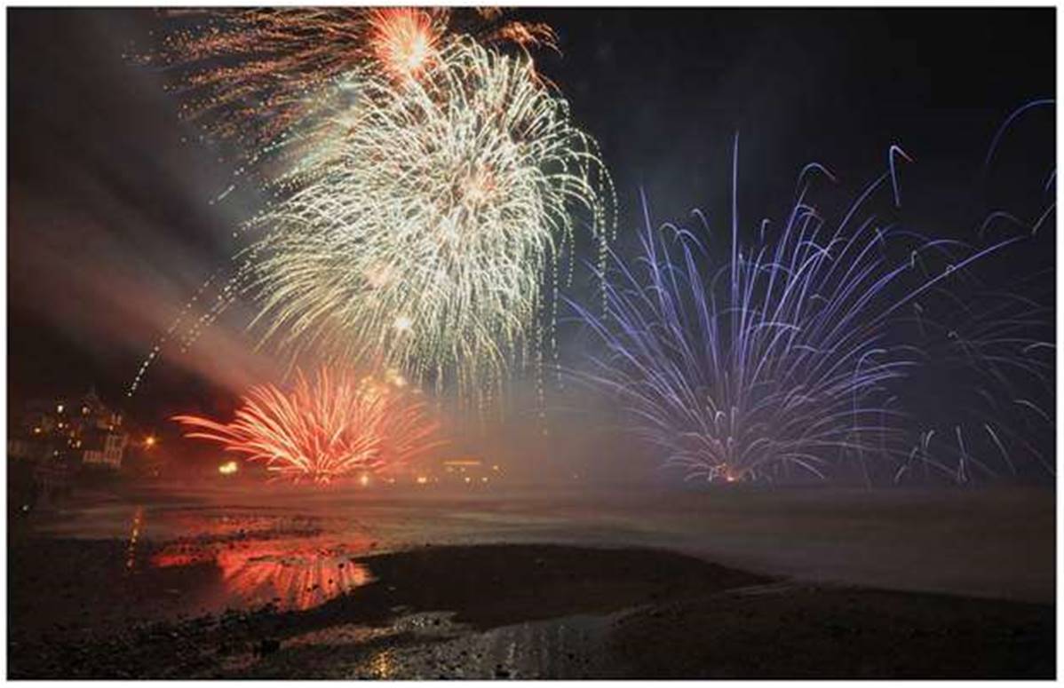 A spectacle of fire lights up the New Years sky with reflections from the wintry surf 21.12.2010