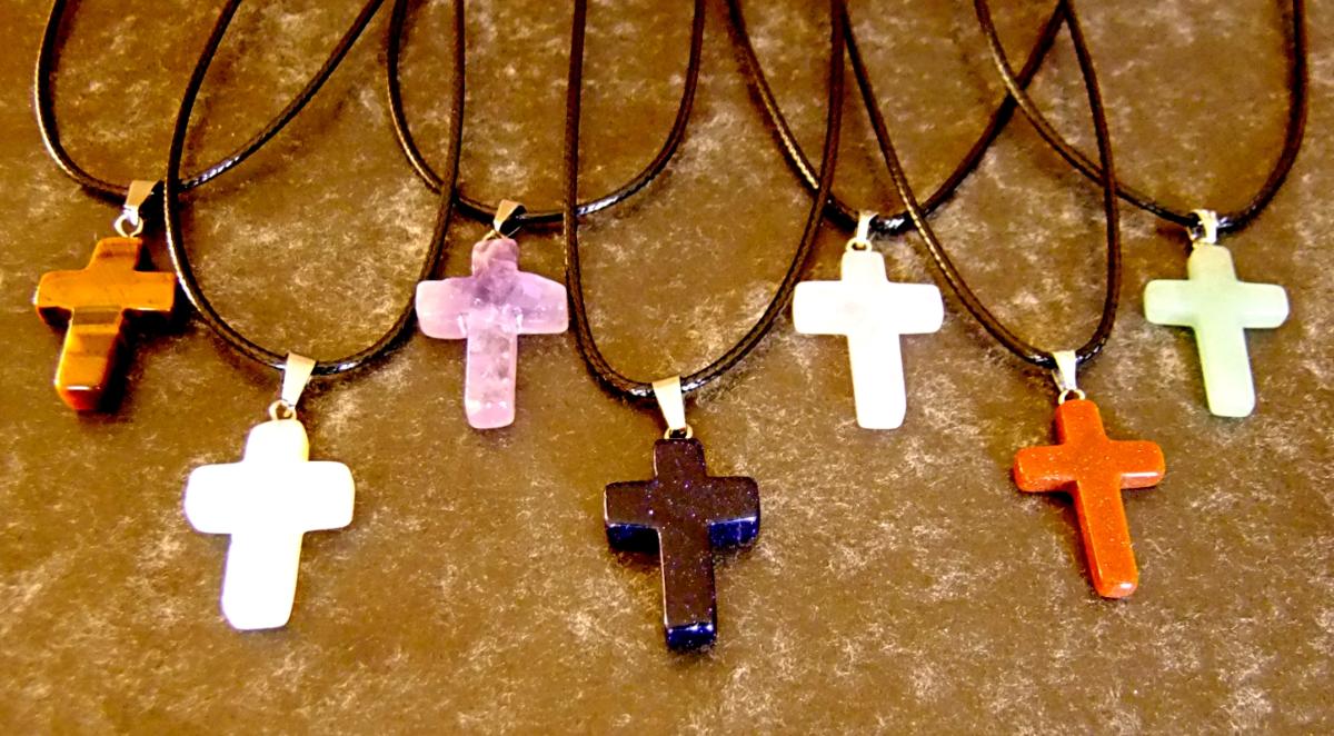 10 PACK CROSS PENDANTS ON WAXED CORDS WITH A SILVER PLATED LOBSTER STYLE CLASP.