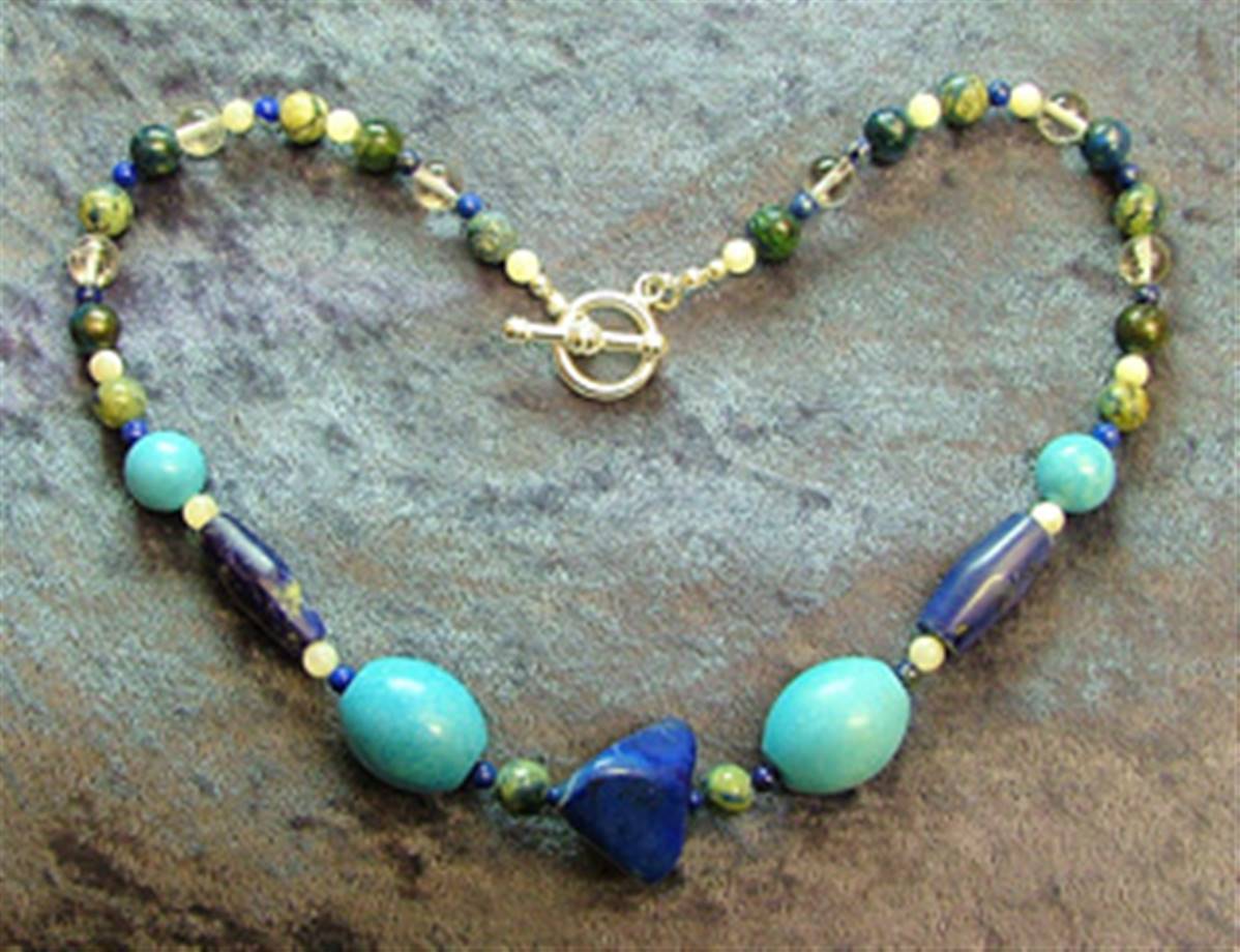 THIS NECKLACE FEATURES BEADS IN ANTIQUE LAPIS LAZULI, TURQUOISE, QUARTZ & MOTHER OF PEARL.