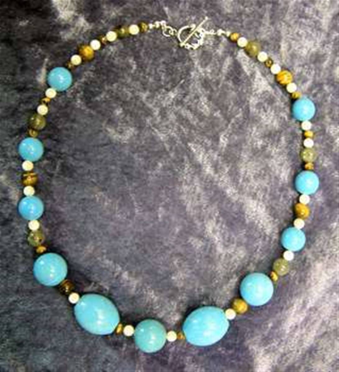 THIS NECKLACE FEATURES BEADS IN TURQUOISE, TIGERSEYE, LABRADORITE & MOTHER OF PEARL.