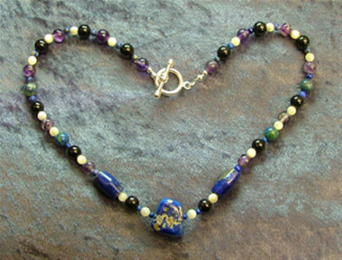 THIS NECKLACE FEATURES BEADS IN ANTIQUE LAPIS LAZULI, AZURITE WITH MALACHITE, FLUORITE, BLUE GOLD STONE & MOTHER OF PEARL.