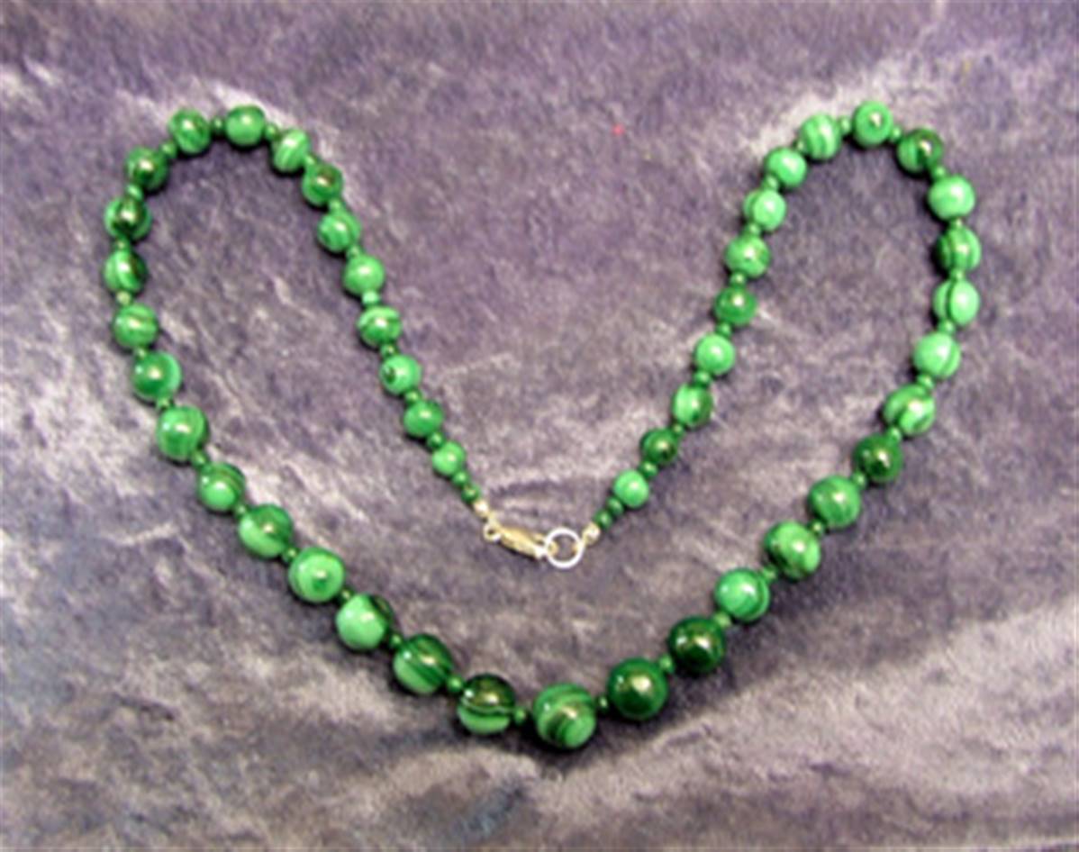 THIS NECKLACE FEATURES BEADS IN MALACHITE.