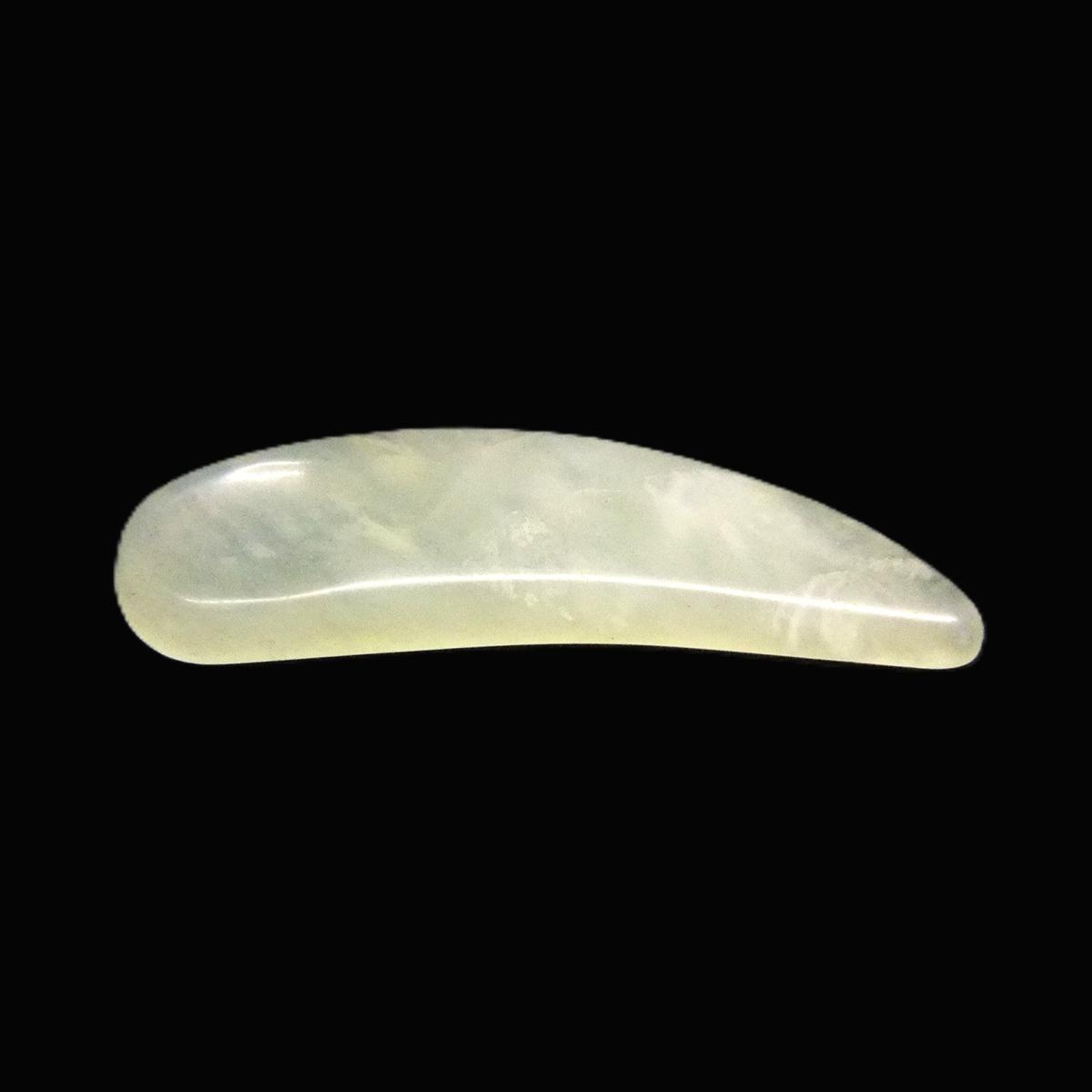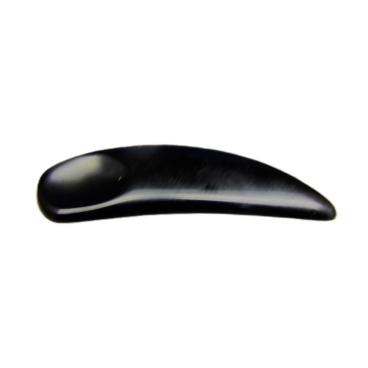 Curved form rounded on one end and pointed on the other, has rounded edges on top face with Thumb dimple & flat back face.