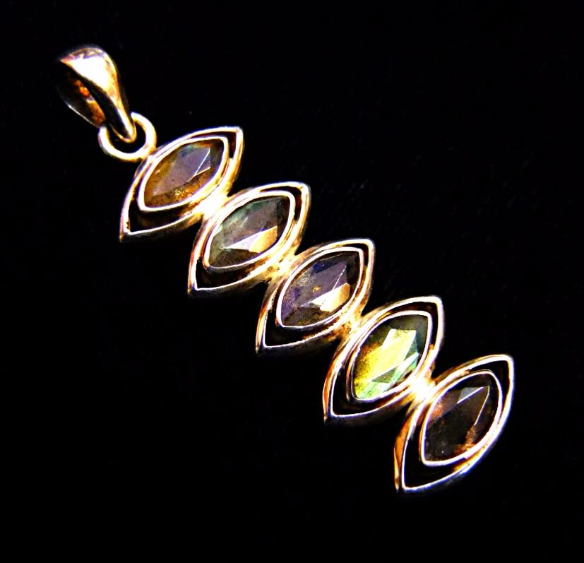 925 SILVER DESIGNER PENDANT FEATURING FIVE FACETED CATSEYE CABOCHONS IN LABRADORITE.