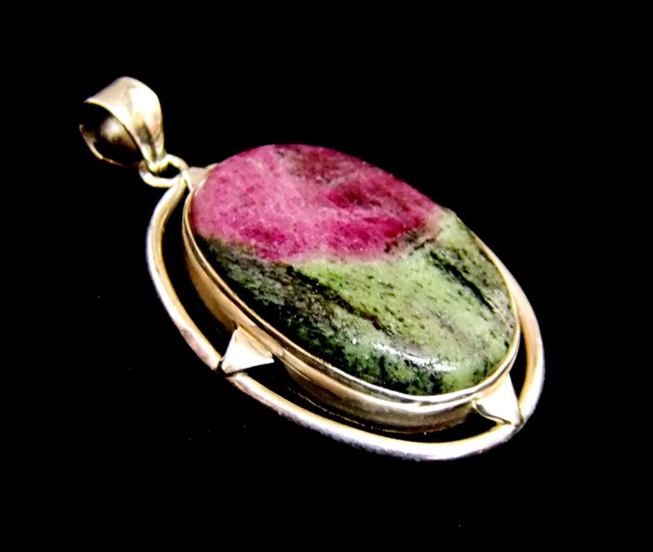 925 SILVER DESIGNER PENDANT FEATURING A LARGE DOME POLISHED CABOCHON STONE IN RUBY WITH ZOISITE.