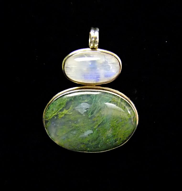 925 SILVER DESIGNER PENDANT FEATURING TWO LARGE DOME POLISHED CABOCHON STONES IN RAINBOW MOONSTONE AND MOSS AGATE.