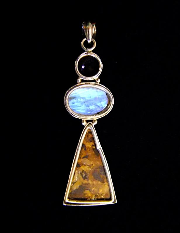 925 SILVER DESIGNER PENDANT FEATURING A ROUND FACETED CABOCHON IN AMETHYST WITH A DOME POLISHED OVAL CABOCHON IN RAINBOW MOONSTONE TOGETHER WITH A POLISHED FACE TRIANGLE SLICE IN BRONZITE.