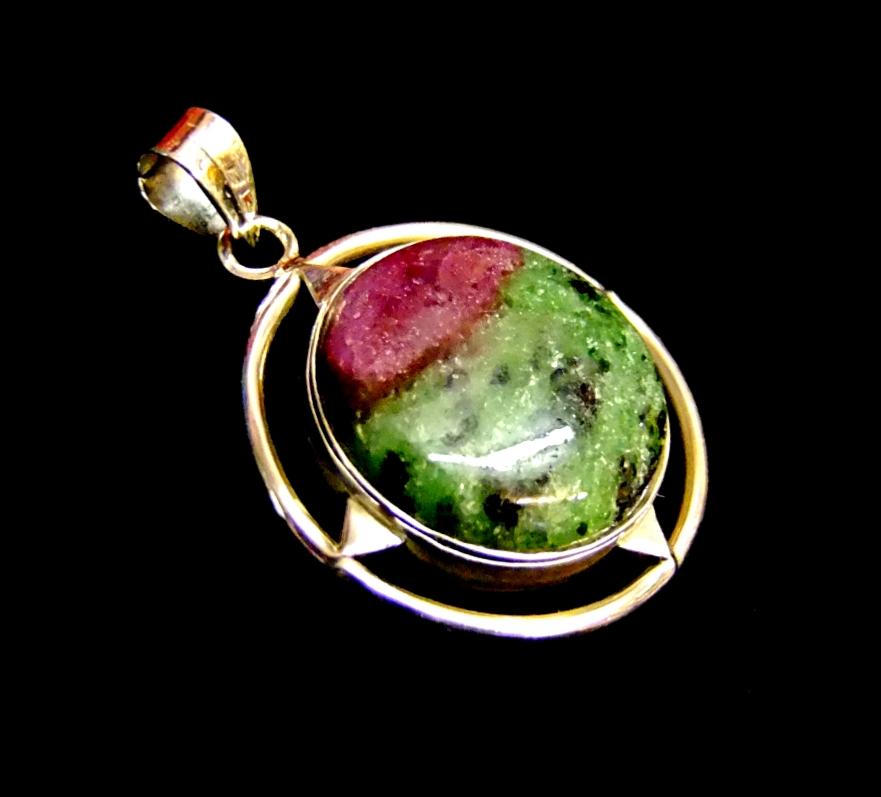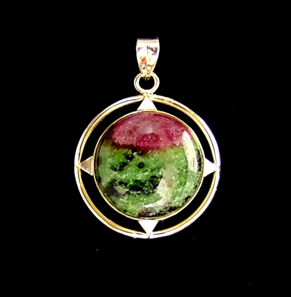 925 SILVER DESIGNER PENDANT FEATURING A SINGLE ROUND DOME POLISHED CABOCHON IN RUBY WITH ZOISITE.