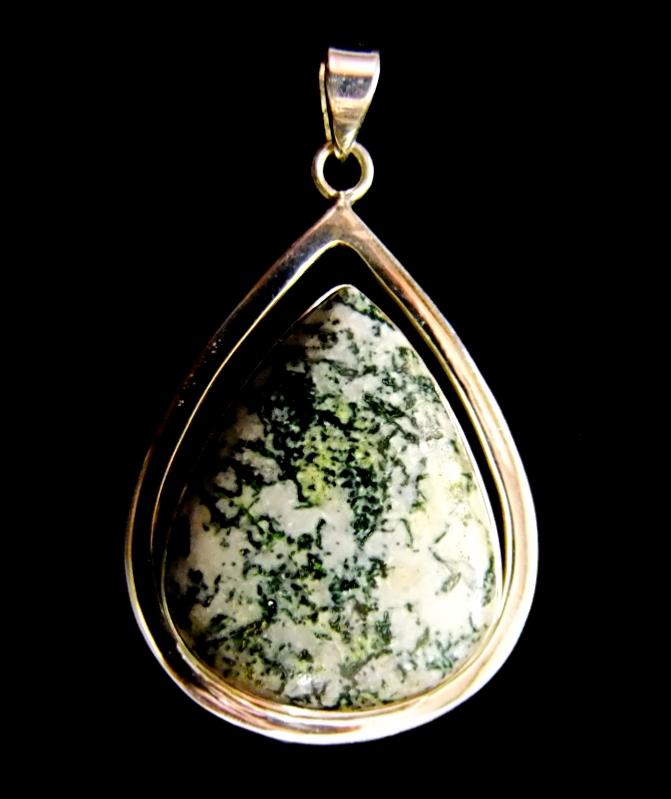 925 SILVER DESIGNER PENDANT FEATURING A SINGLE TEARDROP DOME POLISHED CABOCHON IN TREE AGATE.