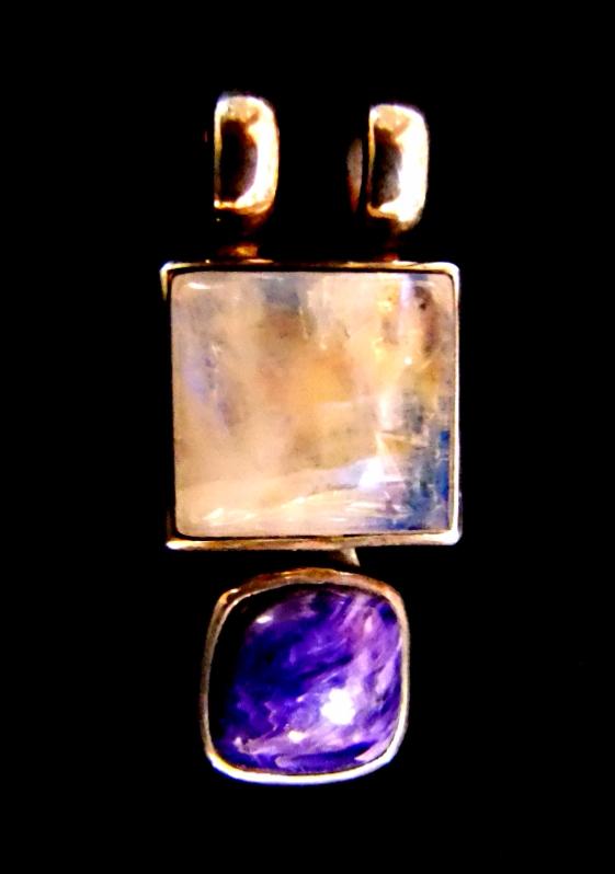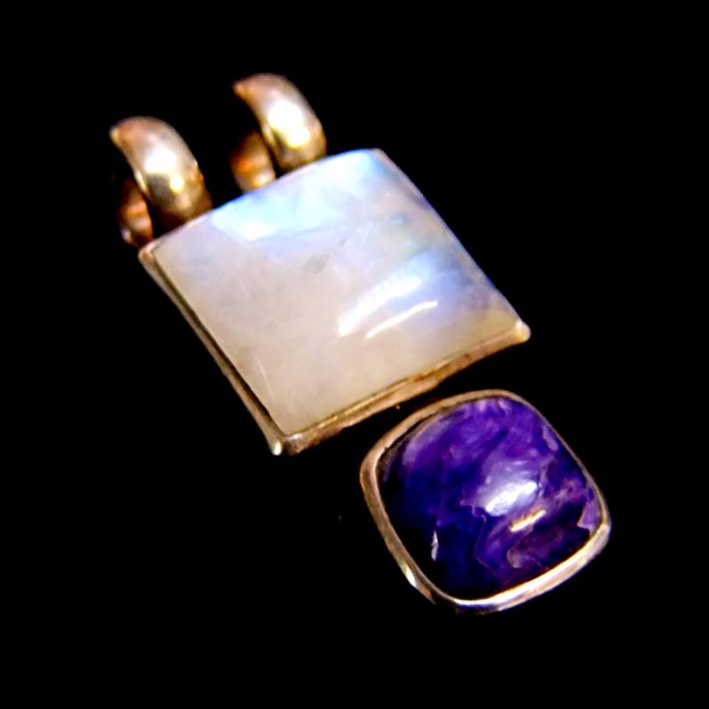 925 SILVER DESIGNER PENDANT FEATURING A SQUARE DOME POLISHED CABOCHON IN MOONSTONE TOGETHER WITH A SMALLER POLISHED CHAROITE CABOCHON.
