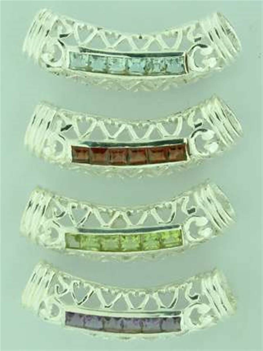 925 SILVER FILEGRE DETAIL PENDANTS SET WITH SQUARE CABOCHONS IN PERIDOT, BLUE TOPAZ, AMETHYST OR GARNET. 35MM WIDE X 10MM. CABOCHON SIZE 3 X 3MM. 4g.