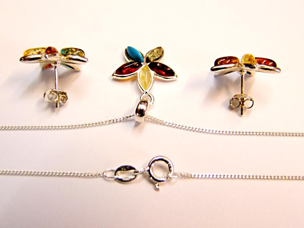 925 SILVER PENDANT & EARRINGS SET IN FLOWER DESIGN, FEATURES CATSEYE SHAPE CABOCHONS IN THREE COLOURES OF BALTIC AMBER & ALSO TURQUOISE.
