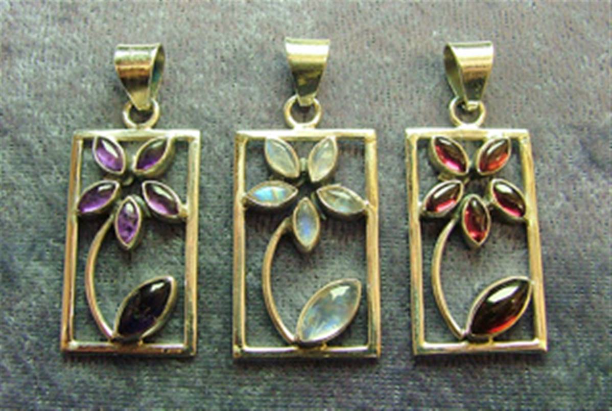 THESE PENDANTS FEATURE FLOWER DESIGN WITH LEAVES & PETALS INSET WITH CABOCHONS IN EITHER AMETHYST, MOONSTONE OR GARNET.