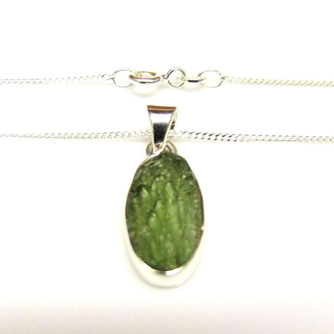 925 Silver pendant necklace set with a  raw Moldavite crystal together with a light 18" silver curb chain with trigger style clasp.