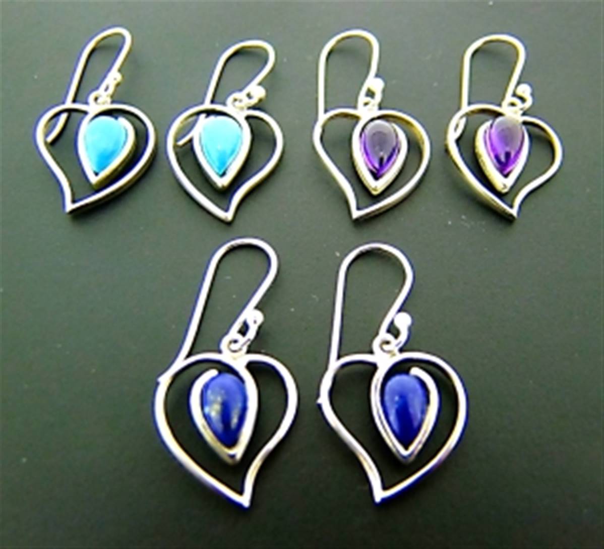 IN HEART DESIGN FEATURING TEARDROP SHAPE CABOCHONS IN EITHER TURQUOISE, AMETHYST OR LAPIS LAZULI.
