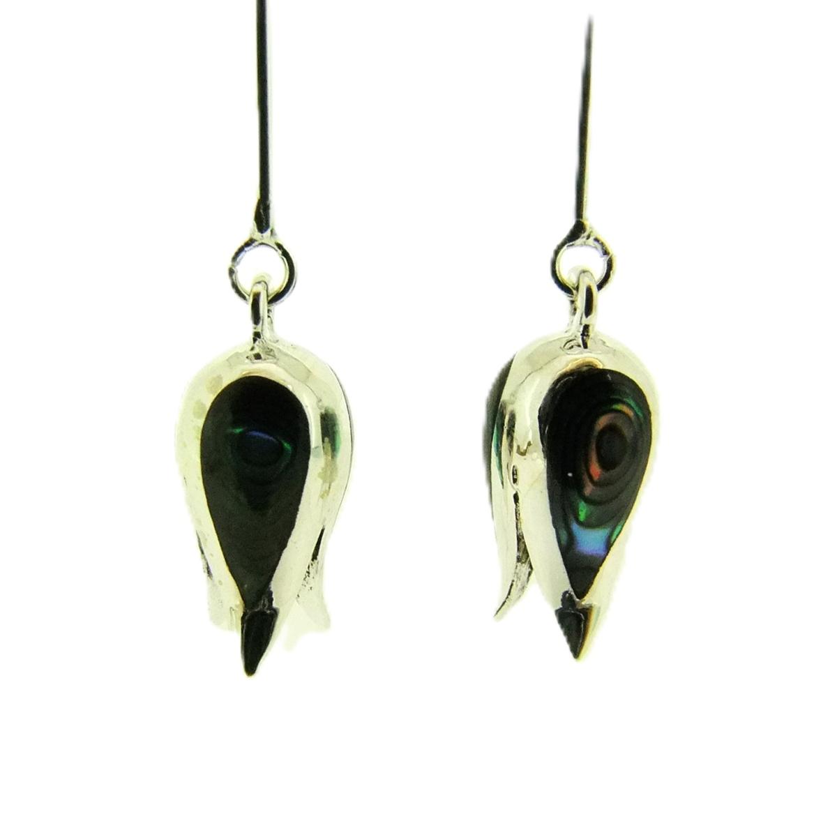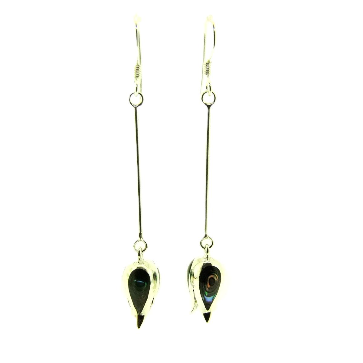 925 Silver Pendant Style Earrings in flower bud design set with teardrop shape sections of abalone shell.