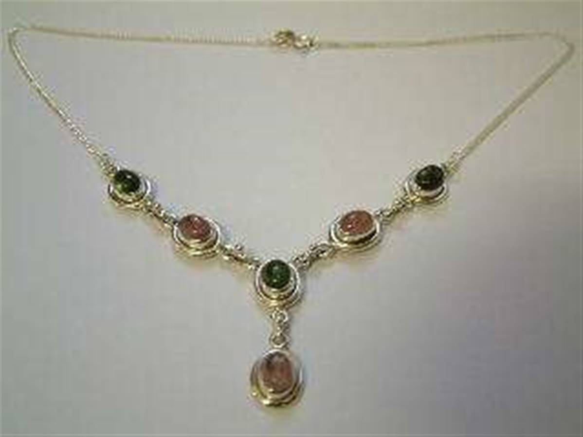 925 SILVER PENDANT STYLE NECKLACE FEATURING OVAL GREEN / PINK TOURMALINE CABS. CAB SIZE - 5 X 8MM. 16" CHAIN.