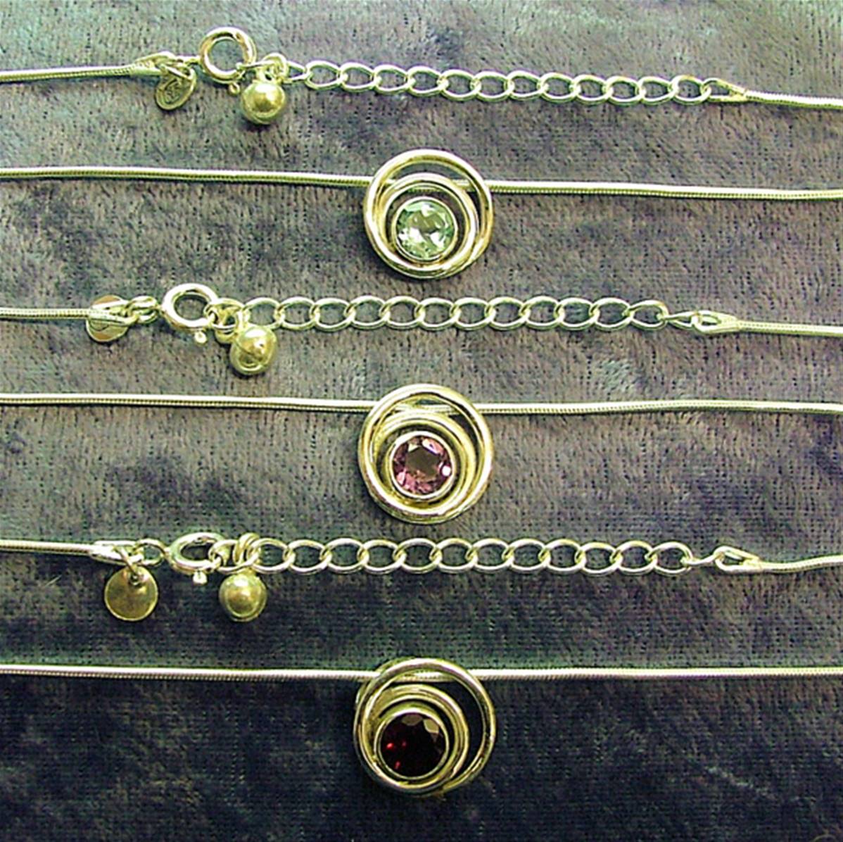 PENDANT NECKLACE FEATURING SNAKE STYLE CHAIN & PENDANT IN A SPIRAL DESIGN WITH A SINGLE ROUND FACETED CABOCHON IN BLUE TOPAZ, AMETHYST OR GARNET.