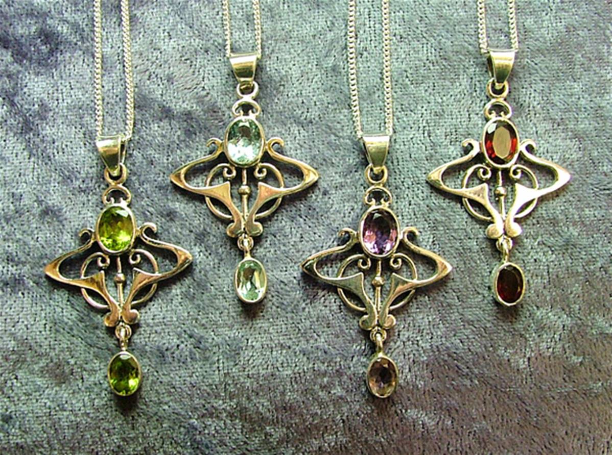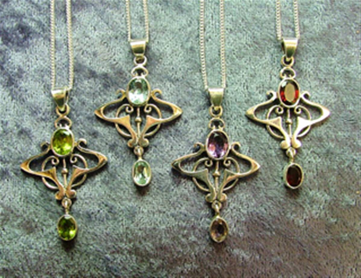 PENDANT NECKLACE FEATURING CURB STYLE CHAIN & ANGEL DESIGN PENDANT WITH TWO FACETED ROUND CABOCHONS AVAILABLE IN PERIDOT, BLUE TOPAZ, AMETHYST & GARNET.