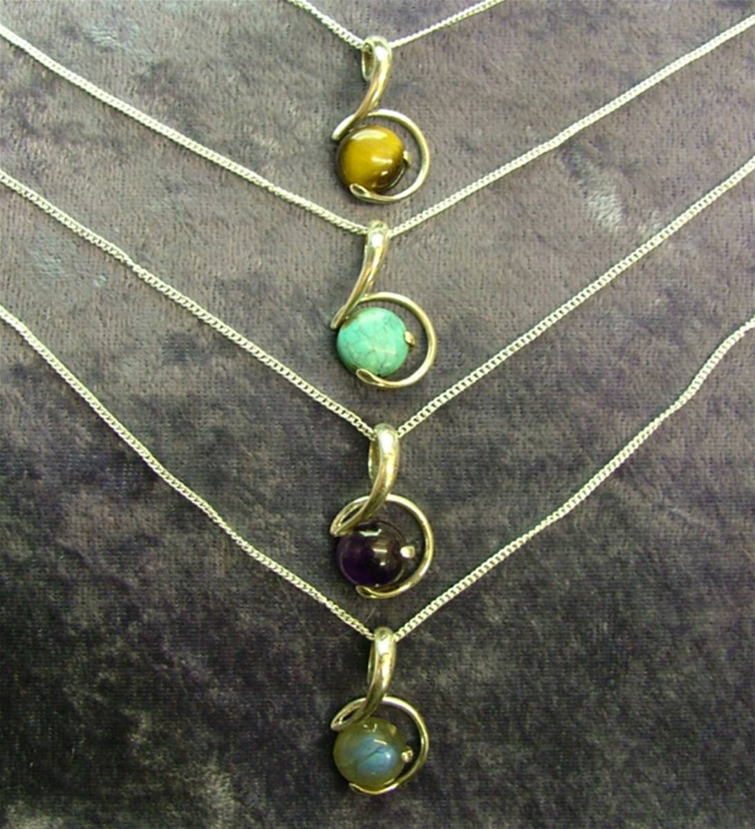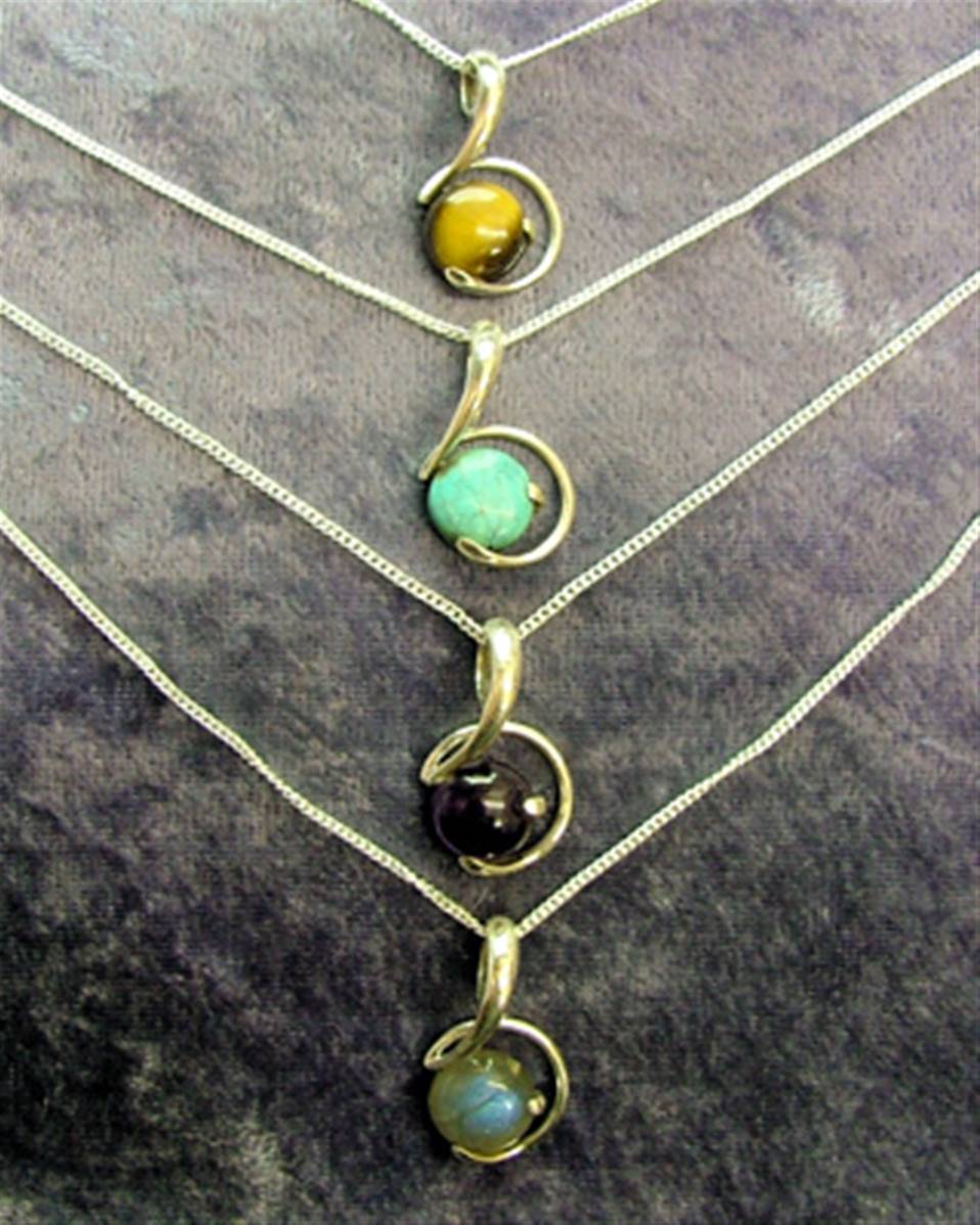PENDANT NECKLACE FEATURING CURB STYLE CHAIN & PENDANT IN A SWIRL DESIGN WITH A SINGLE ROUND CABOCHON IN AMETHYST, TURQUOISE OR TIGERSEYE.