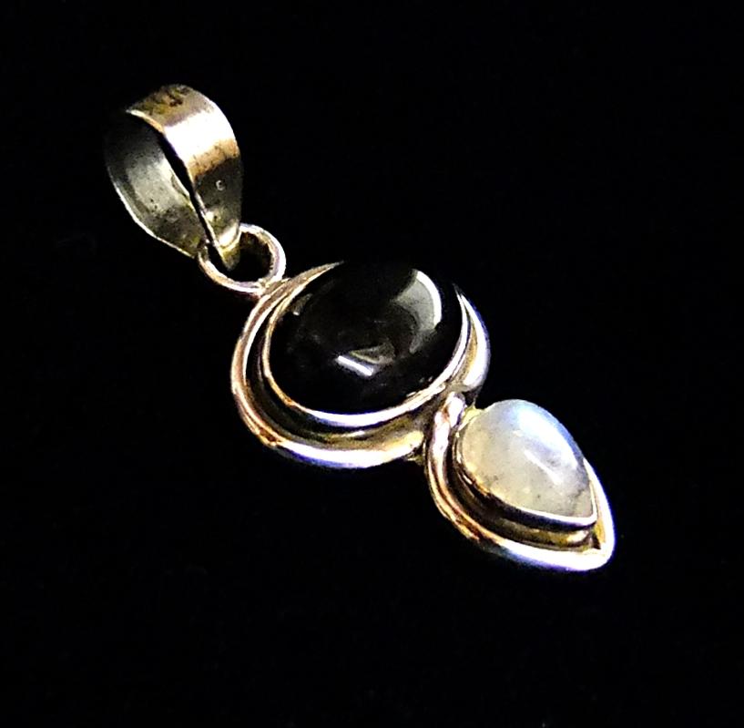 • 925 SILVER PENDANT WITH BLACK ONYX & RAINBOW MOONSTONE CABOCHONS.   SPR11383PEND