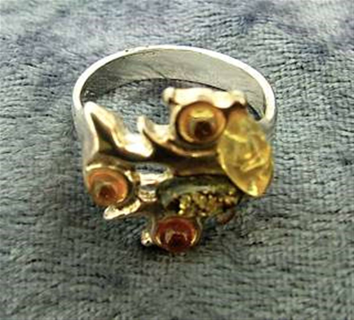 THIS RING FEATURES SMALL OVAL & ROUND SHAPE CABOCHONS IN RED, GREEN & YELLOW BALTIC AMBER.