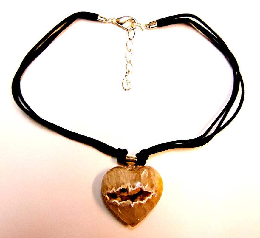 AGATE GEODE HEART PENDANT ON BLACK CORD.