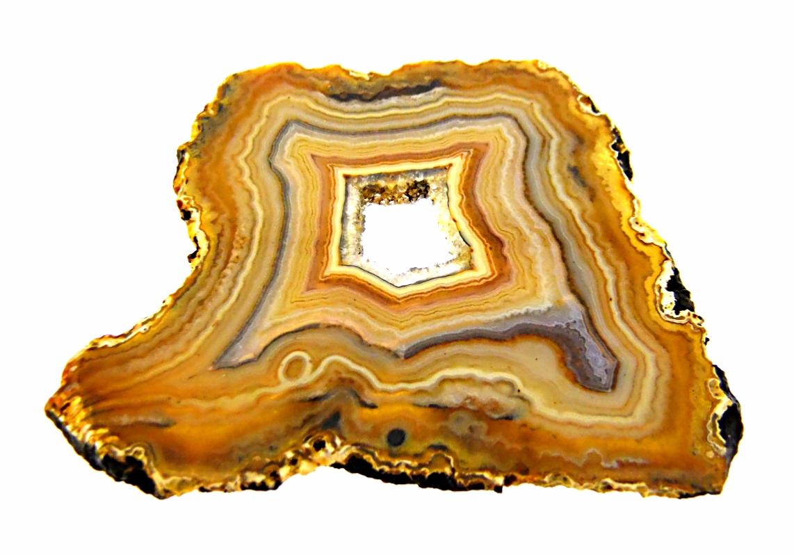AGATE GEODE SLICE SPECIMEN FEATURING POLISHED CUT FACES.