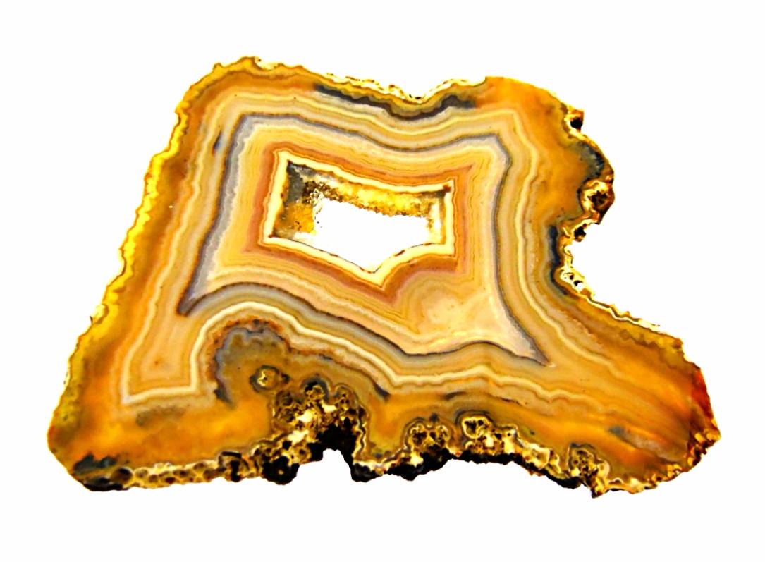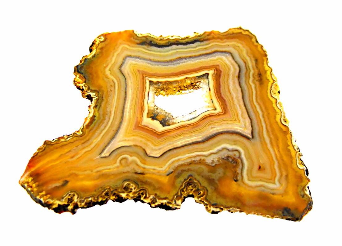 AGATE GEODE SLICE SPECIMEN FEATURING POLISHED CUT FACES.