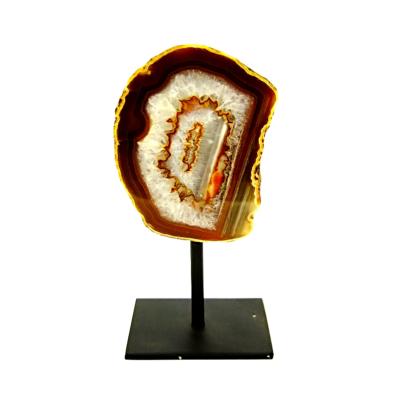 AGATE HALF NODULE SPECIMEN ON METAL STAND. FEATURES POLISHED CUT FACE, BROWN COLOURING.