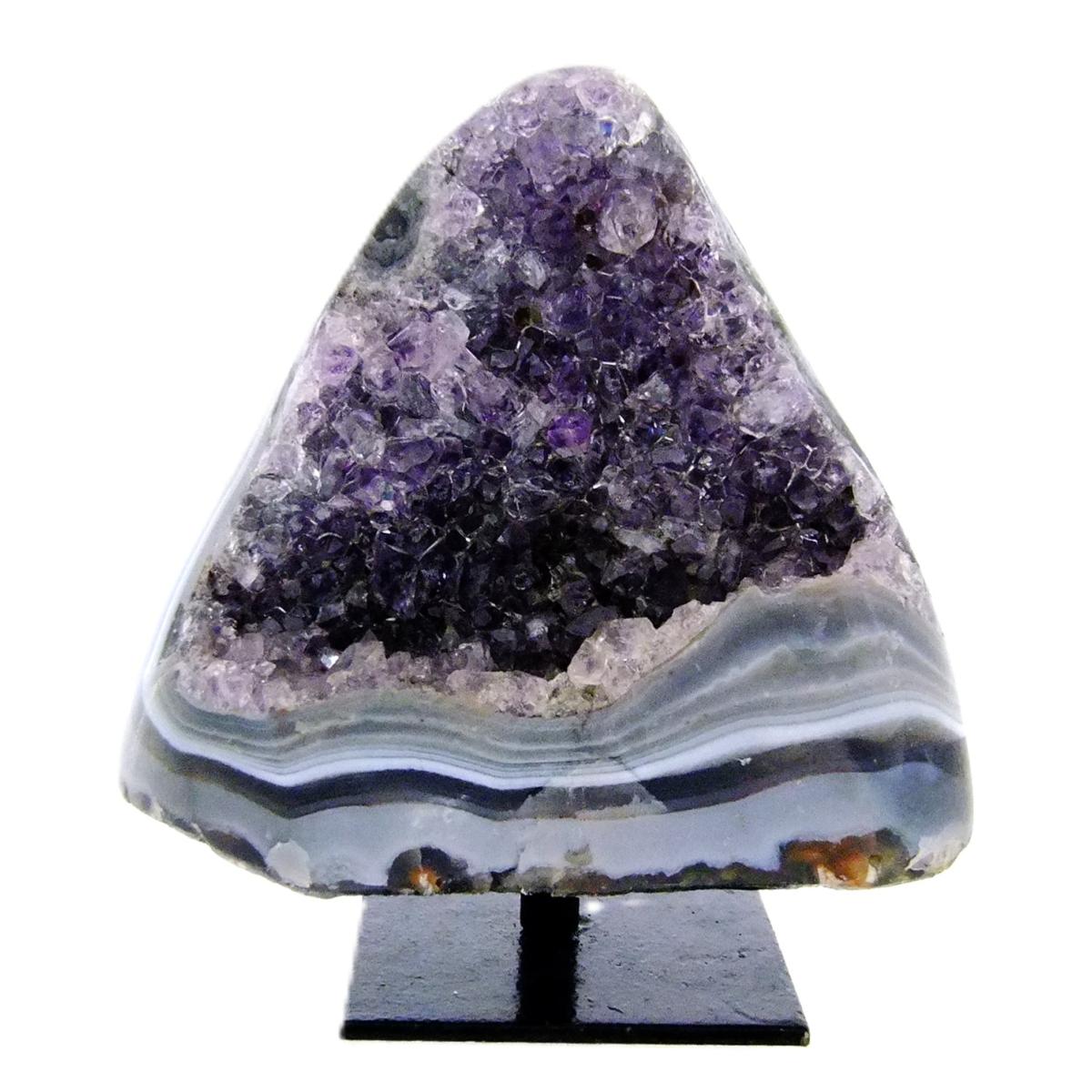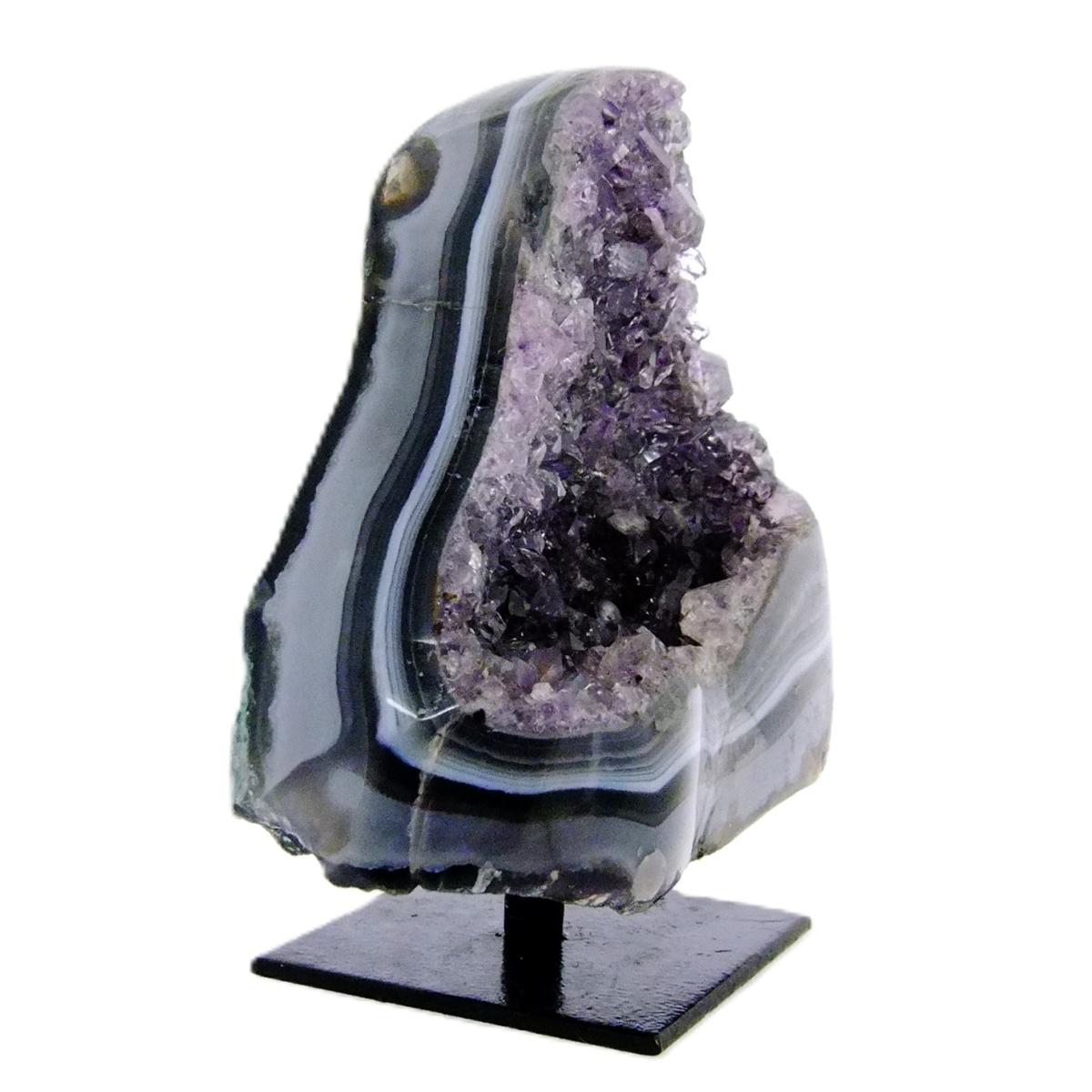 Agate Rimmed Amethyst Druze Specimen Featuring Polished Edge And Metal Stand.
