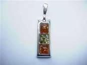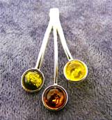 | Crafted for us in Gadansk Poland from 925 silver this classically styles amber pendant has 2 golden and 1 green amber cabochons.The oblong measures just over 2.5cm in length and 1cm wide. A timeless design.
