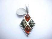 | Crafted for us in Gadansk Poland from 925 silver & in gold and green Amber, this striking diamond shaped pendant measures 2cm in width and 4cm from top to bottom including the silver loop.