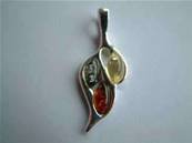 | Crafted for us in Gadansk Poland from 925 silver in a modern design, this very individual pendant is set with yellow,gold and green amber.Length from top to bottom is just under 5.5cm.