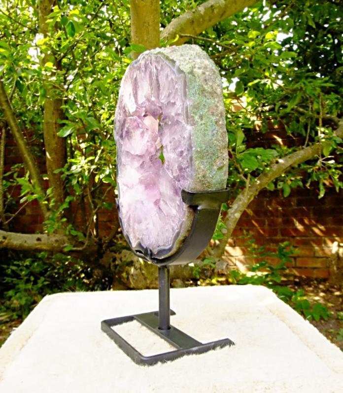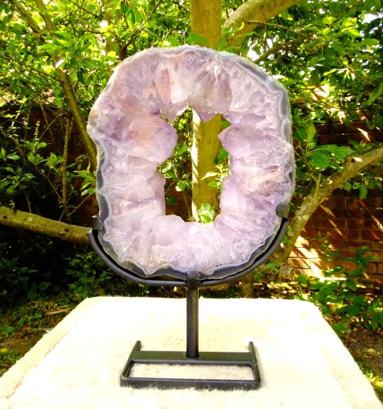 AMETHYST GEODE SLICE/ RING SPECIMEN FEATURING POLISHED FRONT & REAR CUT FACES, MOUNTED ON METAL DISPLAY STAND.
