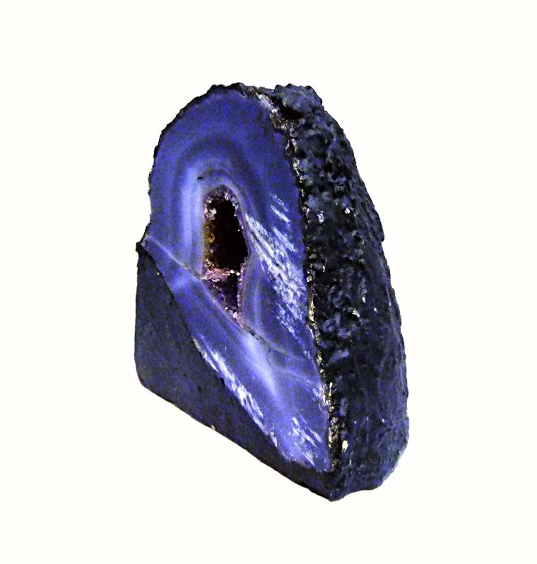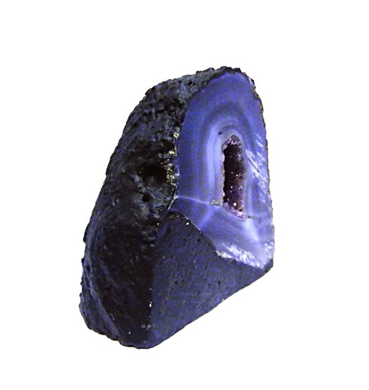AMETHYST WITH AGATE MINI CAVE SPECIMEN FEATURING POLISHED FLAT CUT FRONT FACE AND FLAT BASE TO STAND.