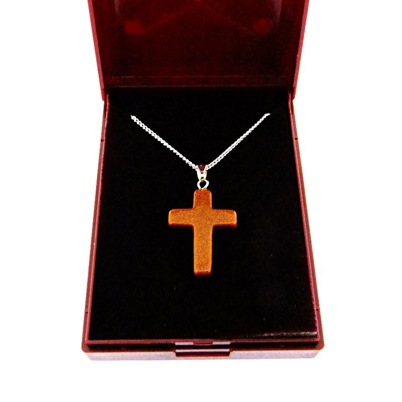 BOXED GEMSTONE CROSS PENDANT IN BROWN GOLD STONE.