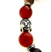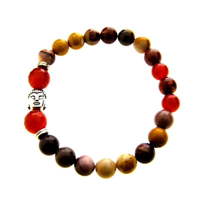 BUDDHA POWER BEAD BRACELET IN MOOKAITE FEATURING FACETED BEADS IN CARNELIAN AND A SILVER BEAD WITH A BUDDHA FACE ON EITHER SIDE.