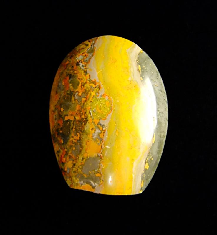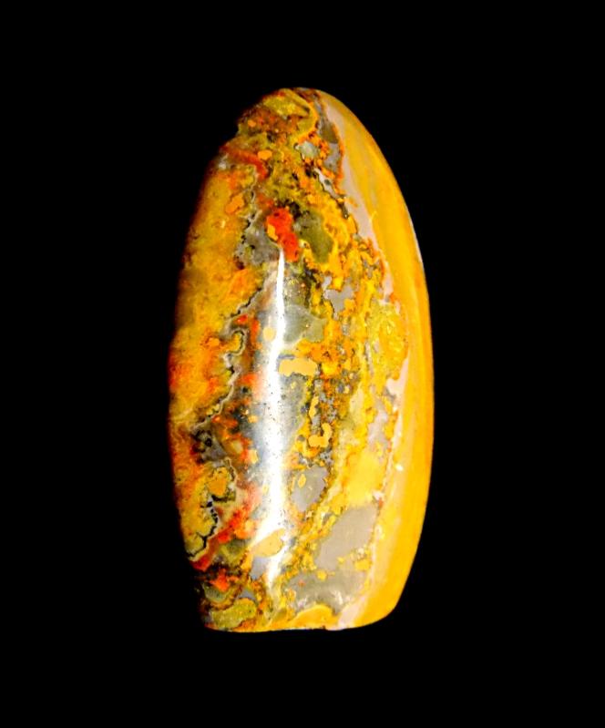 BUMBLE BEE JASPER POLISHED FREE FROM SPECIMEN WITH FLAT CUT BASE TO STAND.