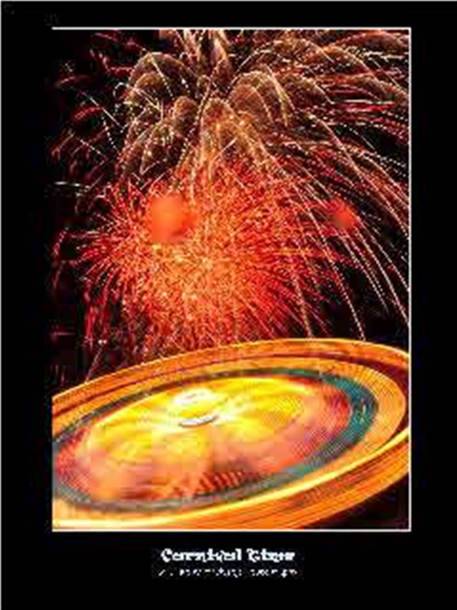 Taken on carnival night on a long exposure, fireworks fill the air as the daring ride on fairground rides and spots of rain distort the lens.