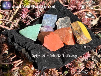 CHAKRA SET OF ROUGH GEM STONES in pouch    SPR14093SET OF RAW CRYSTAL SPECIMENS IN CHAKRA COLOURS.