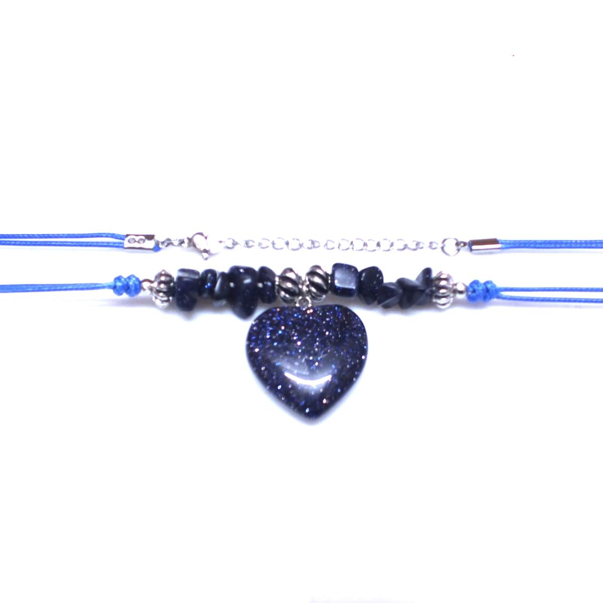 • Chip & Bead Necklace Featuring Blue Goldstone & Silver Plated Beads And a Heart Pendant On Blue Cord.   SPR16981NEC