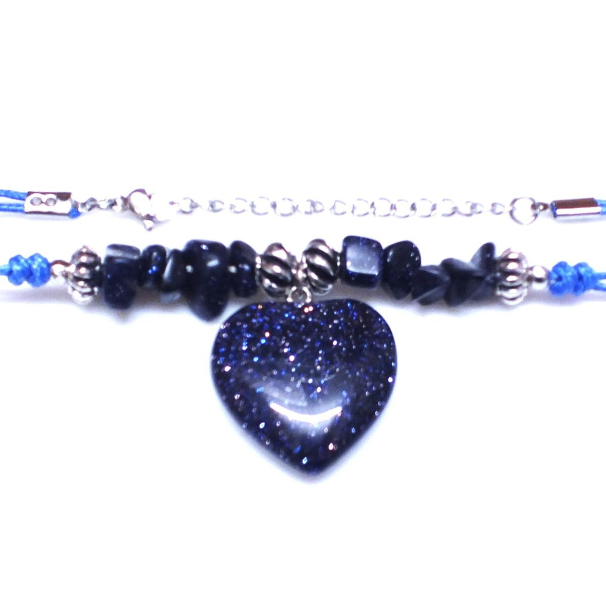 Chip & Bead Necklace Featuring Blue Goldstone & Silver Plated Beads And a Heart Pendant On Blue Cord With Lobster Style Clasp With Extender Chain.