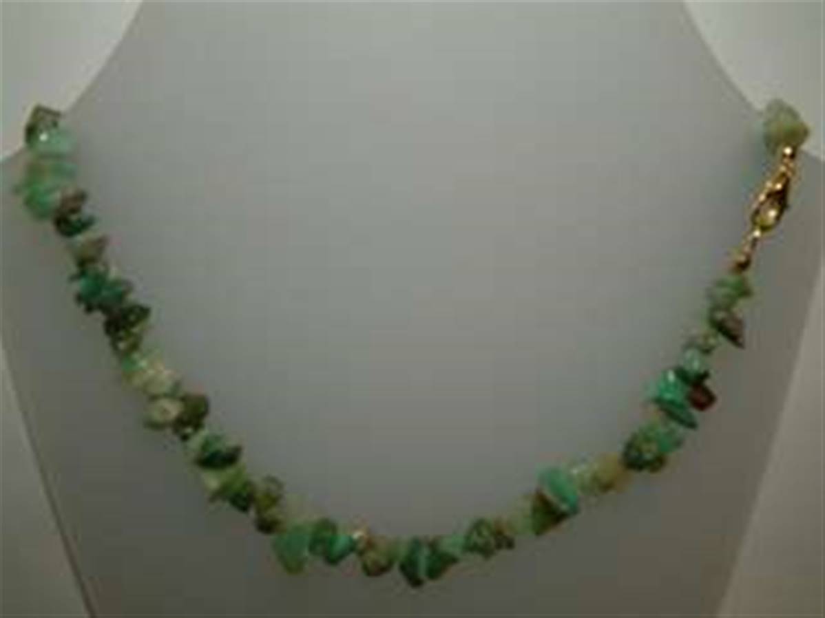 CHRYSOPRASE GEM CHIP NECKLACE FEATURING A GOLD PLATED LOBSTER STYLE CLASP (10 PACK). 18" LONG. 32g EACH.