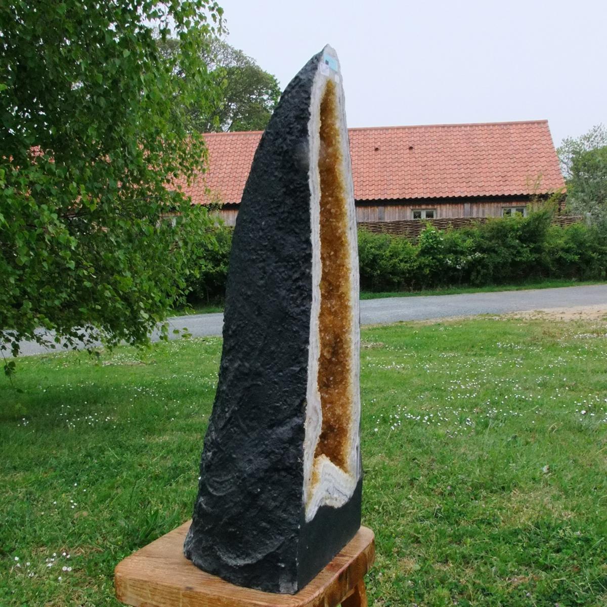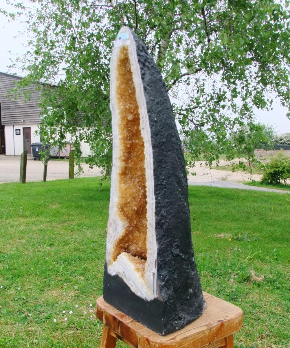 Citrine Cave specimen featuring polished cut front face and flat base to stand.