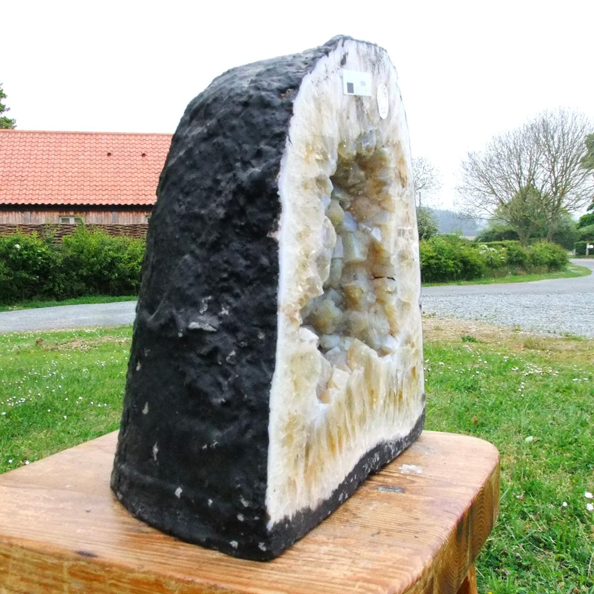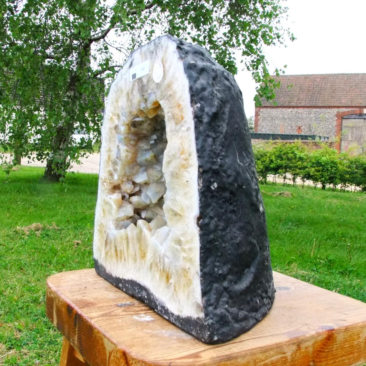 Citrine Cave specimen featuring polished cut front face and flat base to stand.