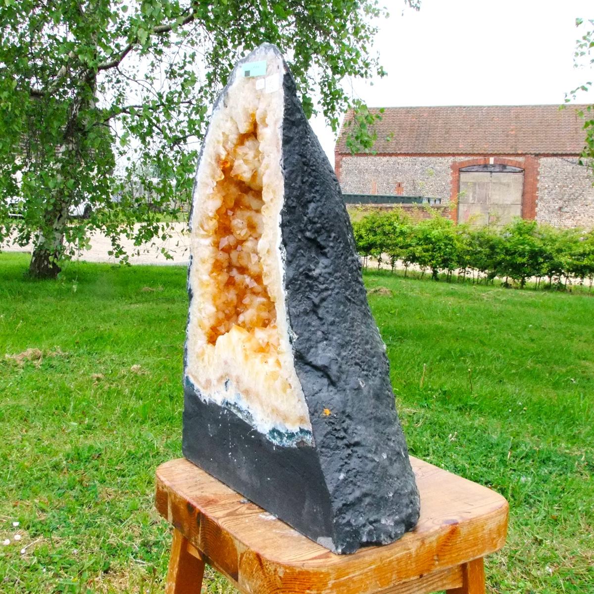 Citrine Cave specimen featuring polished cut front face and flat base to stand.