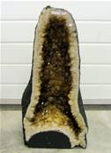 This Citrine cave features Calcite crystal formations inside with polished edge & flat base to stand.