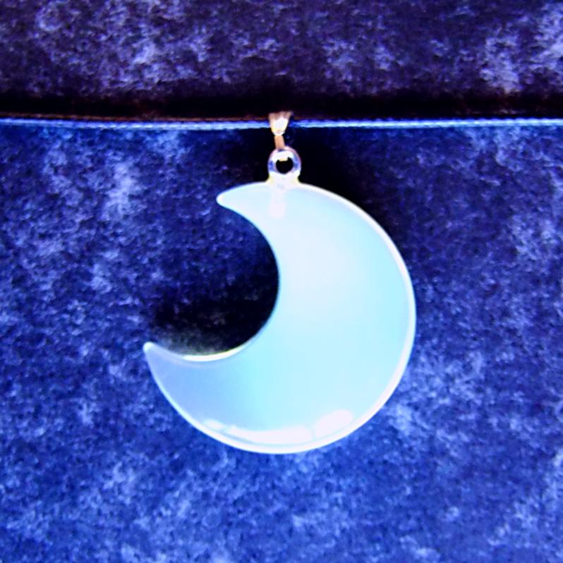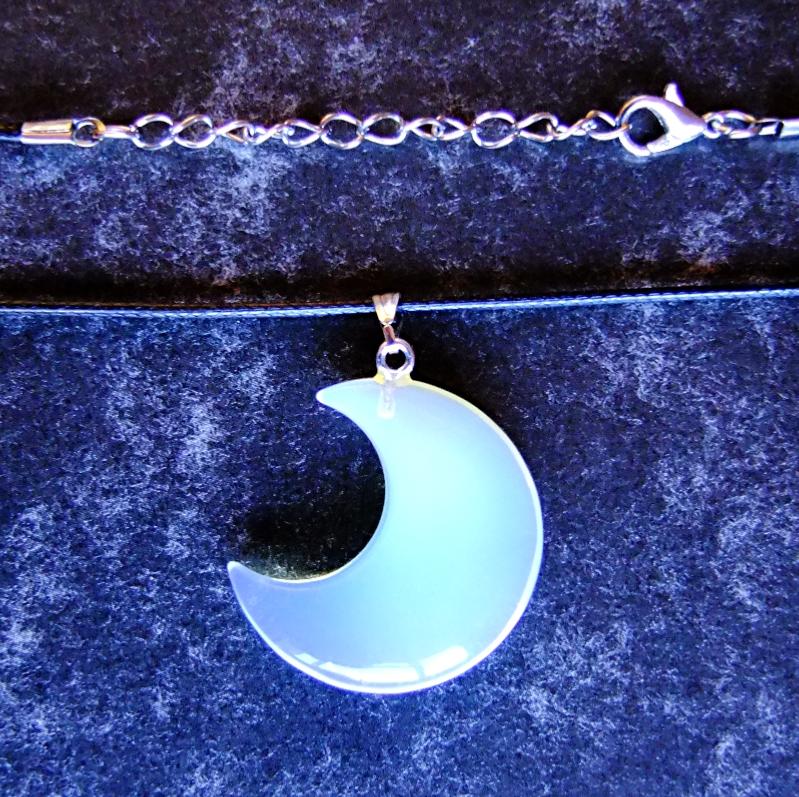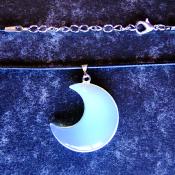 CRESCENT MOON PENDANT IN OPALITE ON WAXED CORD FEATURING A SILVER PLATED LOBSTER STYLE CLASP.