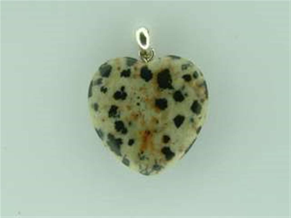 DALMATIAN STONE HEART SHAPED PENDANT COMPLETE WITH SILVER BAIL. 32MM DROP INC BAIL X 25MM WIDE. 6g.